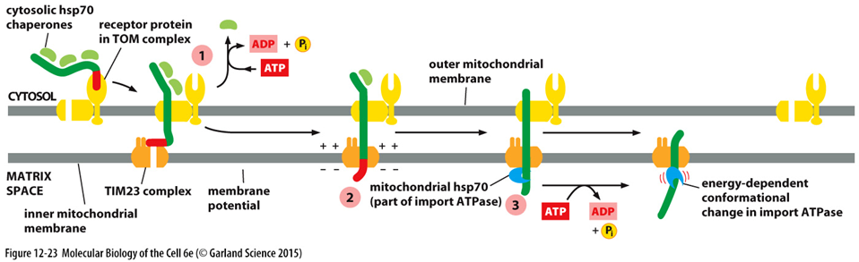 한편 3과 같이, 미토콘드리아 안에 있는 Hsp70은 접히지 않은 상태의, TIM, TOM complex로부터 막 들어온 단백질에 대해 높은 친화력을 가지고 있어서 미토콘드리아 안으로 살짝 머리를 내민 단백질이 더 잘 내부로 이동할 수 있도록 도와줘요. 이후 ATP의 가수분해에 의해서 얻은 에너지로 본격적으로 Hsp70에 의해 단백질이 내부로 끌려들어오게 되면서 최종적으로 수송이 완료되는거죠.