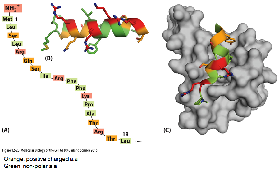 위 그림에는 mitochondria로 갈 단백질들이 포함하고 있는 signal sequence가 나타나 있어요. 이 signal sequence는 특별히 alpha helix 구조를 가지고 있고, 이 alpha helix 구조가 위 그림 (C)에 회색으로 나타나 있는 import receptor에 인지되는 일이 일어나요.