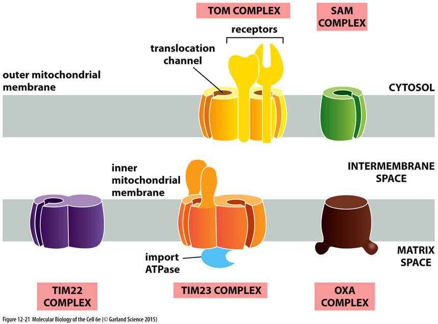 앞서 살펴본 특정 signal sequence를 가지고 있는 단백질이 mitochondria 내부로 수송되기 위해서는 위 그림에 나타나 있는 각종 protein translocator들이 매우 중요하게 작용해요. (이 때 mitochondria 막에 있는 이들 protein translocator는 단백질 복합체의 일종으로, mitochondria로 올 단백질에 대한 receptor 역할을 할 뿐만 아니라 translocation channel을 형성하는 기능도 가지고 있어요) 특별히, 외막에 있는 TOM complex, 내막에 있는 TIM complex가 매우 중요하게 작용하는데, 흔히 TIM-TOM complex와 같이 쌍으로 외워두면 편해요.
