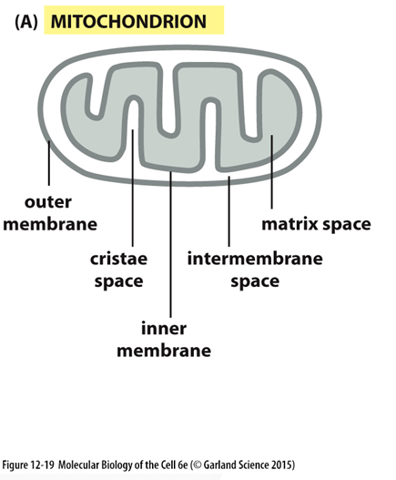 위 그림에는 mitochondria(미토콘드리아) 내부 구조에 대한 명칭이 표시되어 있어요. 간단히 살펴보면, mitochondria는 2개의 막으로 구성되어 있고, 안쪽에 있는 막이 inner membrane(내막), 바깥쪽에 있는 막이 outer membrane(외막)이에요. 그리고 내막과 외막 사이 공간을 intermembrane space(막사이공간)라고 불러요. 그 밖에, 내막 안쪽의 공간을 matrix(기질)라고 부른다는 것도 알아두시면 좋아요!