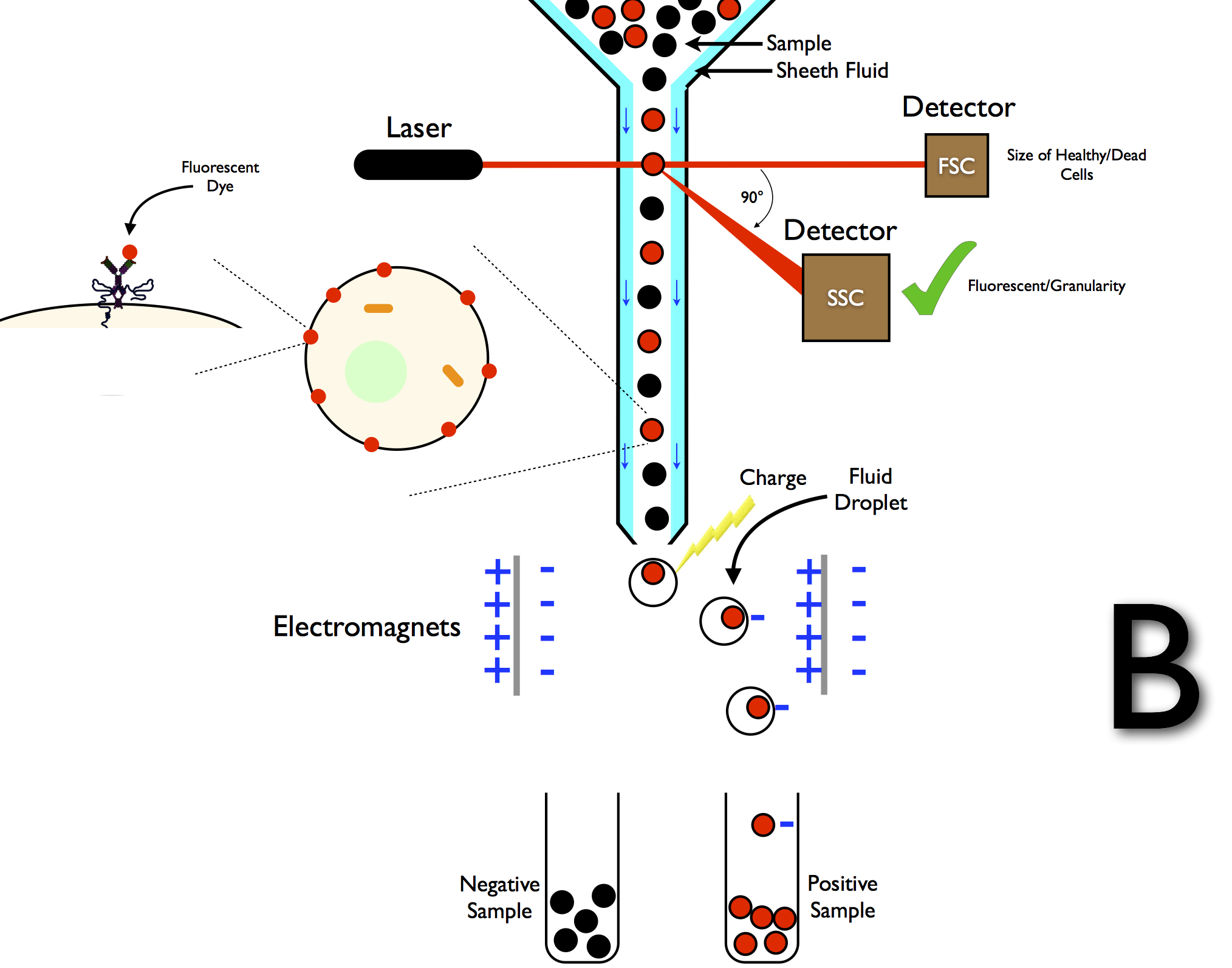 떨어지는 과정에서 형광 detector를 이용해 세포 하나하나를 구분할 수가 있어요.