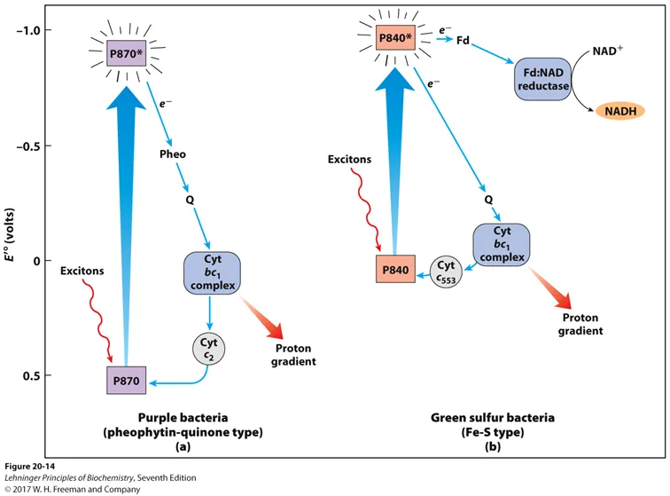 위 그림 (a)에는 purple-bacteria(pheophytin-quinone type)의 photophosphorylation mechanism이, (b)에는 green sulfur bacteria(Fe-S type)의 phorophosphorylation mechanism이 나타나 있음.