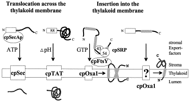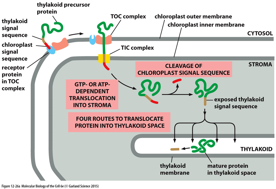 우선 단백질 내에 chloroplast signal peptide(엽록체로 가게끔 하는 신호 서열)과 thylakoid signal sequence(엽록체 내의 틸라코이드로 가게끔 하는 신호 서열)이 있다면, 이 단백질은 염록체의 외막(outer membrane)에 있는 TOC complex에 결합해요.