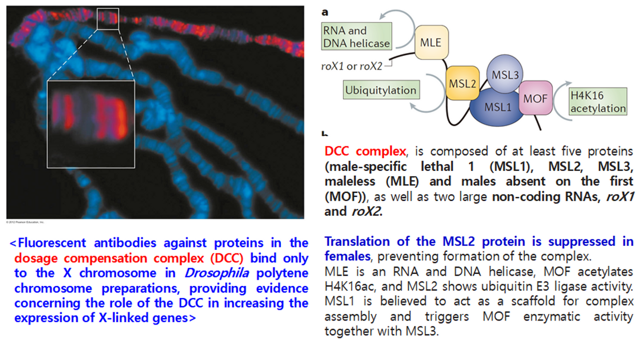 이 때 중요하게 작용하는 것이 바로 위 그림 오른쪽 위에 나타나 있는 DCC(dosage compensation complex)인데, 이 DCC는 단백질과 RNA가 뭉쳐진 복합체이며, 이 녀석이 한 개의 X chromosome만 있을 경우 X chromosome에 붙어서 2배만큼 발현이 많이 되게 해줌.