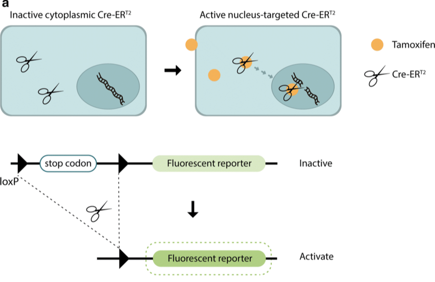 CreERT2는 Cre와 변형된 에스트로겐 수용체 도메인이 결합된 단백질이에요. 평소에는 세포질에 머무르다가, Tamoxifen이라는 약물을 처리하면 핵으로 이동해 loxP 재조합을 유도해요. 덕분에 연구자는 원하는 시점에 유전자를 제거하거나 활성화할 수 있게 되죠.