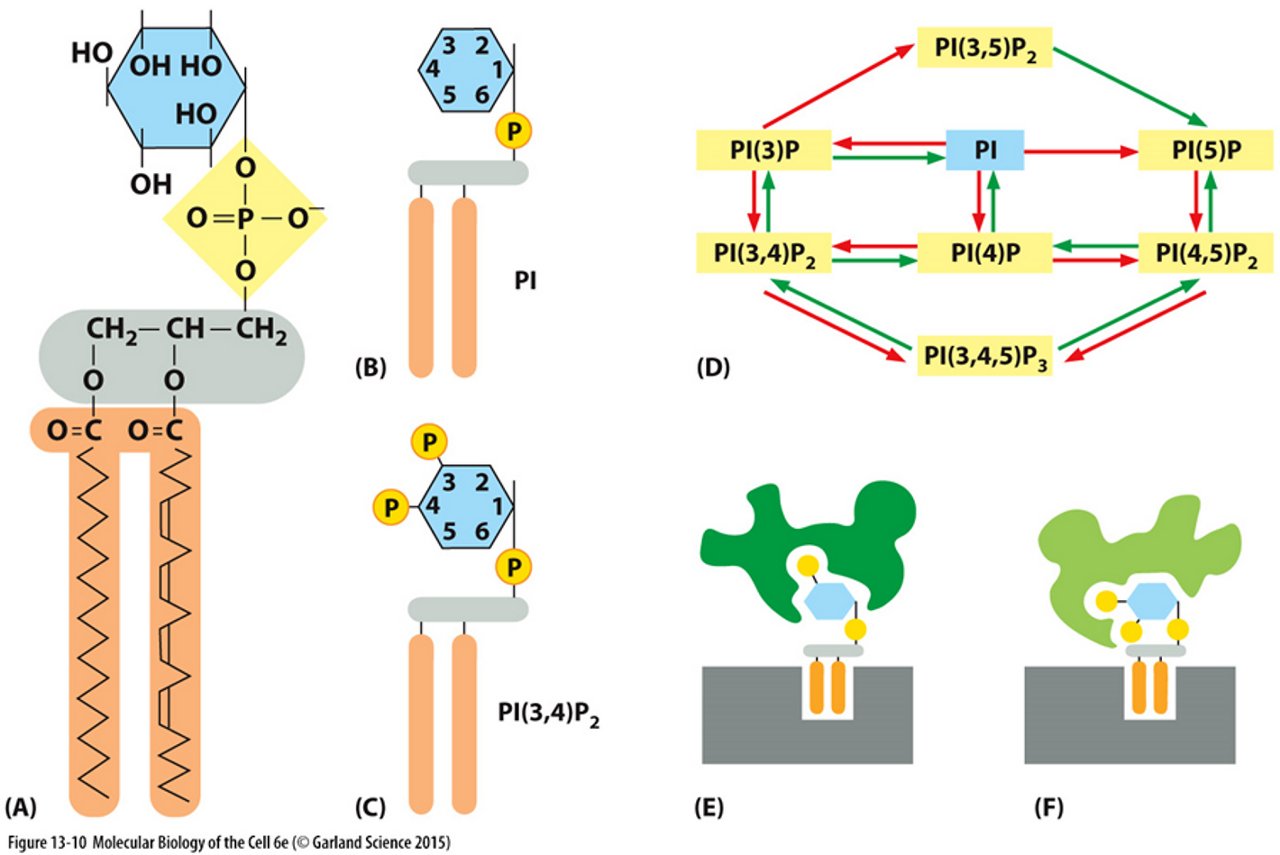예를 들어 (C)와 같이 3, 4번 탄소에 인산기가 달려있는 경우에는 PI(3,4)P2로 명명해요. 그런데 실제로 세포소기관마다 이 PIP들의 조합이 달라요. 그리고, 위 그림 (E), (F)와 같이 각각의 다른 PI 조합을 특이적으로 인지하는 단백질들이 또 각각 존재하기 때문에, 결과적으로 세포는 세포소기관막을 종류에 따라 구분할 수 있게 되는거죠.