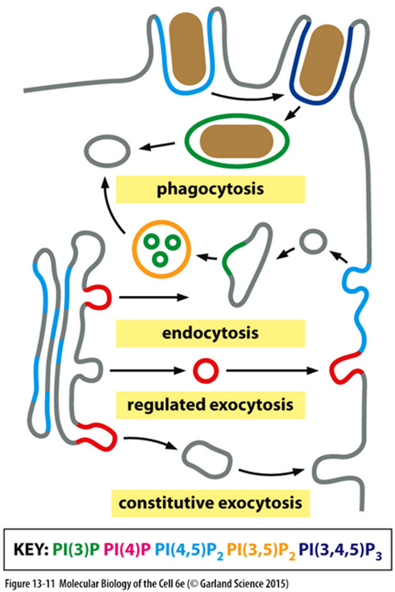 예를 들어 secretory vesicle에 많은 PI(4)P의 경우, secretory vesicle이 plasma membrane과 합쳐지게 되면 plasma membrane의 PI5 kinase(인산화효소)에 의해서 PI(4,5)P2로 변환되어요. (실제로 이렇게 변환된 채 plasma membrane에 존재하는 PI(4,5)P2가 clathrin-coated vesicle이 형성되기 위한 docking site로 기능해요) 한편 다시 plasma membrane으로부터 vesicle이 형성되면, vesicle 안에 있는 PI5 phosphatase(탈인산화효소)에 의해서 PI(4,5)P2가 다시 PI(4)P로 전환되는 식이에요.