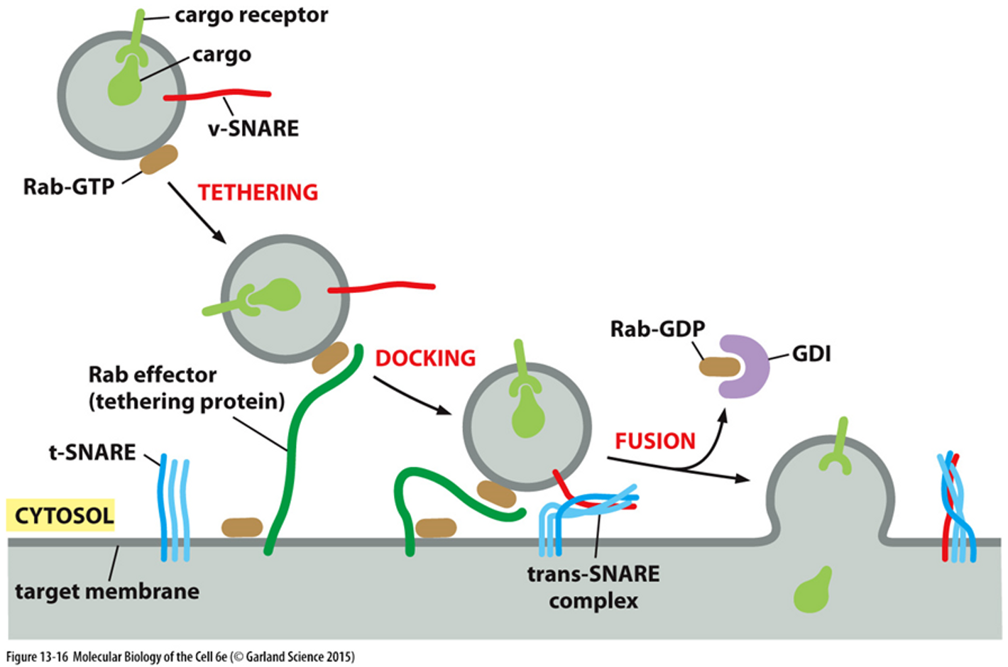 1. vesicle의 막에는 (cargo molecule의 종류에 따라 제각기 다른 목적지에 맞게 특정한) Rab-GTP가 존재하고 있고, 또한 특정한 v-SNARE(vesicular SNARE, vesicle에 존재하는 SNARE)도 존재하고 있음.