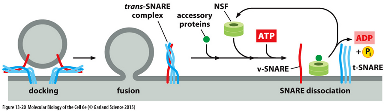 5. fusion이 완료되면 SNARE complex도 떨어진 후 여러 단백질과 ATP에 의해 dissociation(분리)됨.