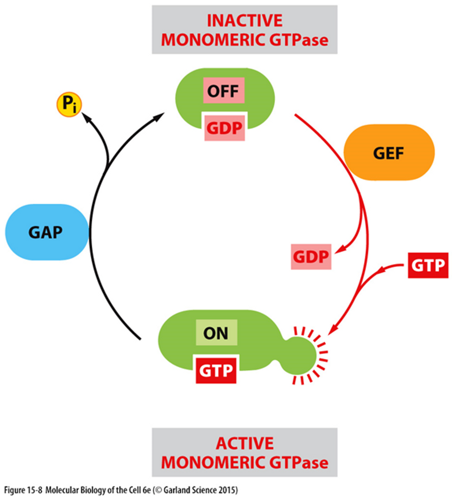 다음으로, GTP binding에 의한 조절의 경우 위 그림에 나타나 있는 것처럼 GAP과 GEF가 매우 중요하게 작동해요. 실제로 GAP은 분자의 GTPase 활성을 켜주어서 분자에 붙어있는 GTP를 GDP로 변화시켜주고, GEF는 GDP를 GTP로 변화시켜주는 역할을 수행해요.