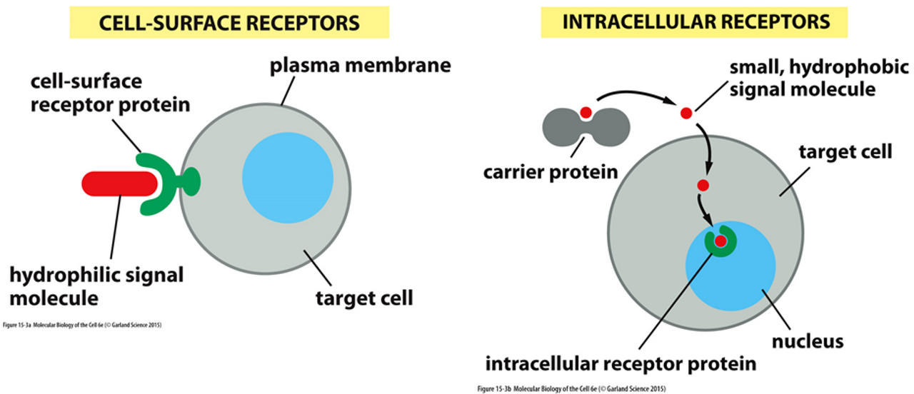 한편, ligand(리간드), 즉 외부에서 유입되는 물질을 받아들이는 receptor에는 위 그림에 나타난 것과 같은 2가지 종류가 있어요. 우선 cell-surface receptor(세포막 수용체)의 경우 주로 수용성 ligand와 결합하며 세포막에 존재해요. (다만 지용성 ligand 중에도 일부의 경우 cell-surface receptor와 결합하기도 함) 한편 intracellular receptor(세포 내 수용체)는 세포질, 혹은 핵 안에 존재하며 세포막을 아무런 저항없이 통과할 수 있는 소수성 ligand들과 결합해요.