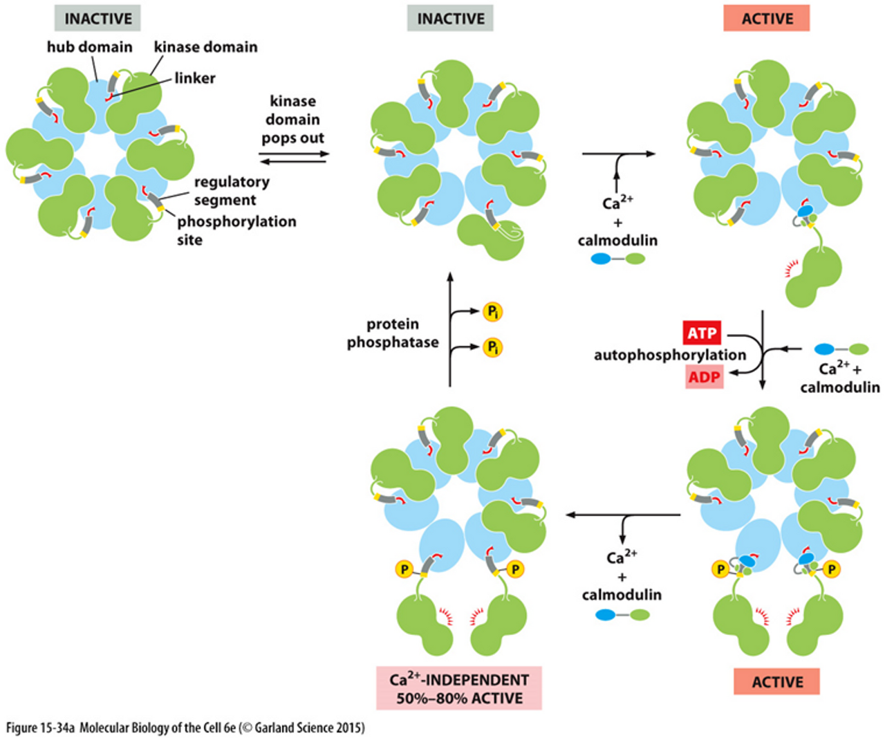 이 때 일단 CaM-kinase가 활성화되고 나면 위 그림 가운데 아래와 같이 Ca2+/calmodulin이 떨어져 나가고 나도 어느 정도는 활성이 유지될 수 있어요. 그러다가, protein phosphatase(탈인산화효소)에 의해서 인산기가 떨어져나가고 나면 비로소 CaM-kinase이 다시금 불활성화되는거죠.