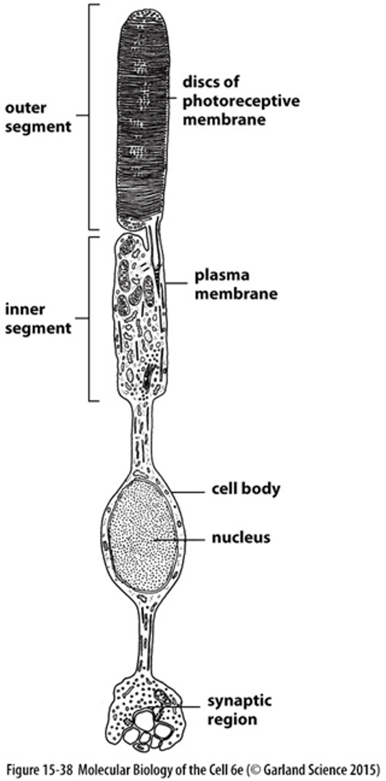 시각정보는 위 그림에 나타나 있는 photoreceptor cell(광수용세포)이 수용해요. 이 때 이 세포는 신경세포(neuron)의 한 종류이며, 이 중 특별히 photoreceptive membrane으로 불리는 세포막의 disc 부근에 많은 수의 photoreceptor(광수용체)가 밀집해 있어요.