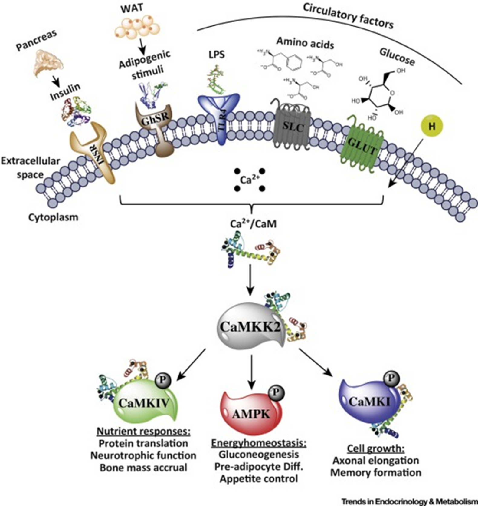 위 그림에는 CaM-kinase에 의해 매개될 수 있는 여러 반응들이 대략적으로 나타나 있으므로 참고해 주세요.