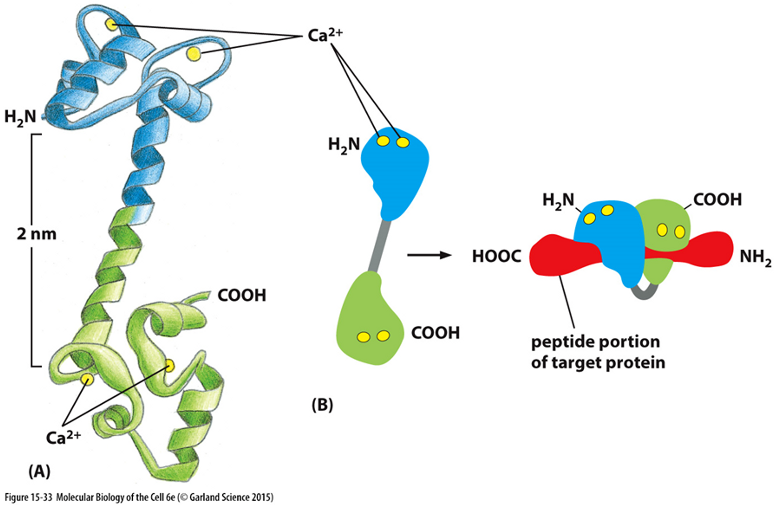 한편, 그 밖에, 칼슘은 위 그림에 나타나 있는 calmodulin(칼모듈린)이라는 녀석과 결합해 이 단백질을 활성화시킬 수 있어요. calmodulin은 아령처럼 생겼으며, 양 끝에 각각 칼슘이온 2개씩이 붙으면 구조 변화가 일어나 서로 겹쳐 (B)의 오른쪽과 같은 구조를 만들게 되는거죠. 이 녀석은 이런 구조를 통해 특정 단백질을 감싸게 되는데, 이 때 Calmodulin이 감싸주는 가장 유명한 단백질 중 하나가 바로 CaM kinase(Ca2+/calmodulin-dependent protein kinase)에요.