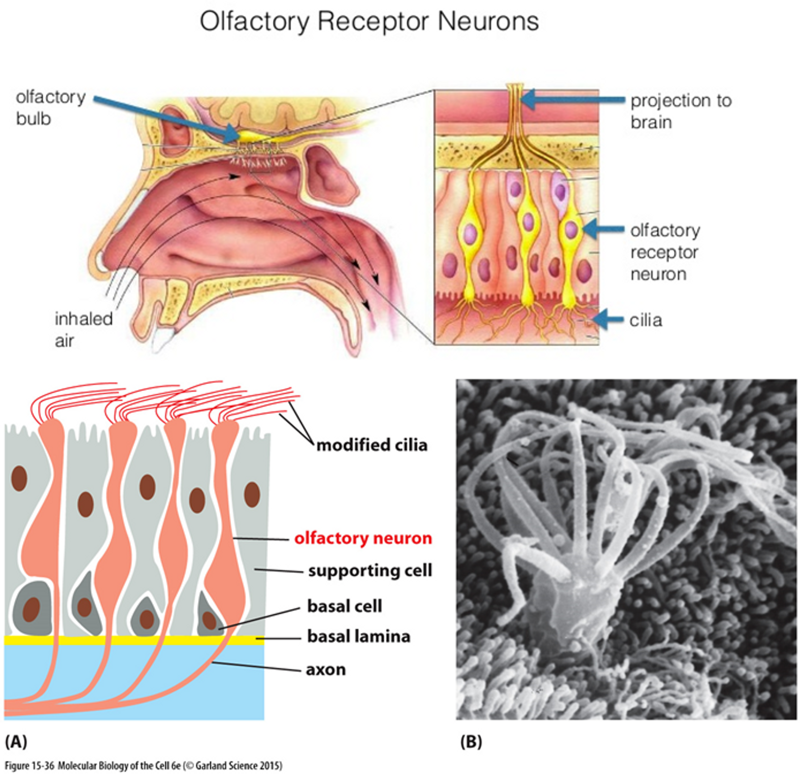 이 때 이런 일이 일어나는 세포들은 위 그림상에 표현되어 있는 olfactory bulb(후각망울)라는 곳에 모여있으며, 이곳의 외부에는 cilia(섬모)가 있어서 odorant molecule들을 받아들이고 이로부터 유발된 탈분극이 그대로 뇌로 전달될 수 있어요.