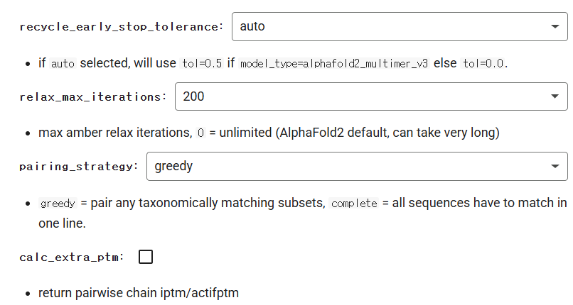 또한, 구조 예측에 사용할 모델 종류도 선택할 수 있어요. Monomer인지, Multimer인지에 따라 다른 모델이 적용되는데요, 이건 AlphaFold가 내부적으로 자동으로 판단해주는 경우가 많지만, model_type 설정에서 수동으로 바꿔줄 수도 있어요. 예를 들어, 여러 사슬로 이루어진 복합체 구조를 예측하고 싶다면 ‘multimer’ 모델을 선택해야 하죠.