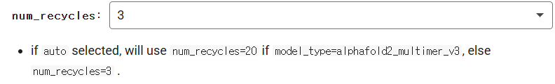 num_recycles는 예측된 구조를 몇 번 반복해서 다듬을지 정하는 값이에요. 기본값은 3이고, 값을 높일수록 정교하지만 계산 시간은 길어져요.