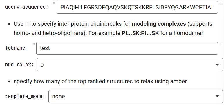 ColabFold에서는 단백질 아미노산 서열을 직접 입력하는 것부터 시작해요. 보통 서열은 한 줄로 쭉 이어진 알파벳(A, C, D, E 등) 형태로 입력하면 되는데요, 각 글자가 하나의 아미노산을 의미해요.
