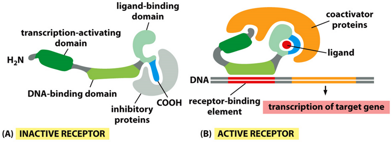 위 그림에는 nuclear receptor읙 전형적인 구조가 나타나 있어요. 보면 내부에 DNA와 결합 가능한 DNA binding domain, DNA의 전사를 활성화시키는 transcription-activating domain, 소수성 ligand와 결합하는 ligan binding domain으로 구성되어 있어요.